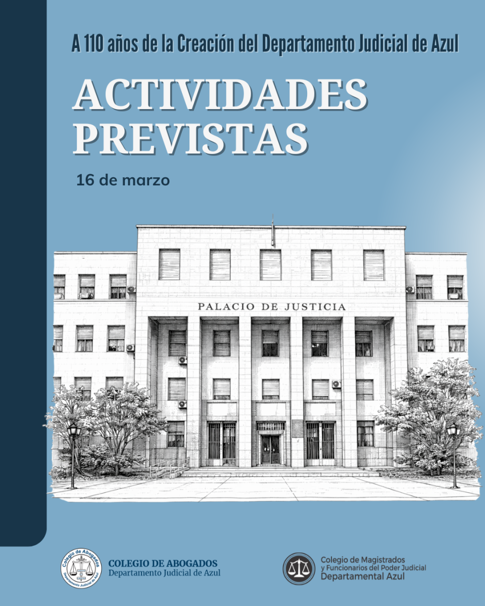 13 marzo, 2026El Colegio de Magistrados y Funcionarios de Azul invita a participar de la jornada conmemorativa por los 110 años de la creación del Departamento Judicial de Azul, un acontecimiento clave en la historia institucional de la región y en la consolidación del servicio de justicia en la provincia de Buenos Aires.